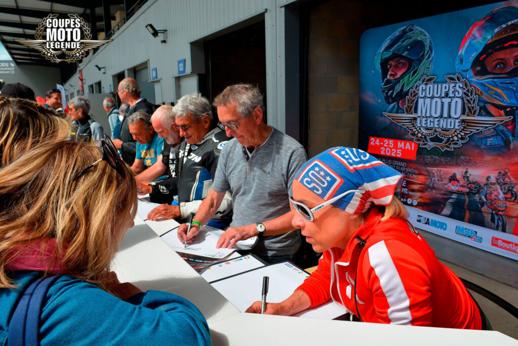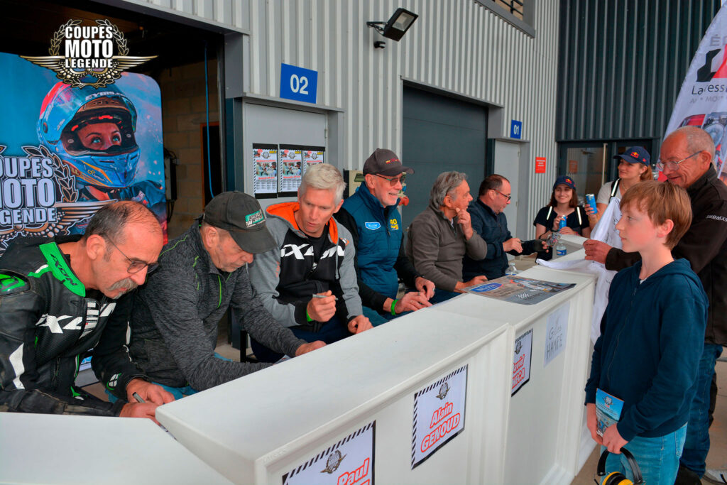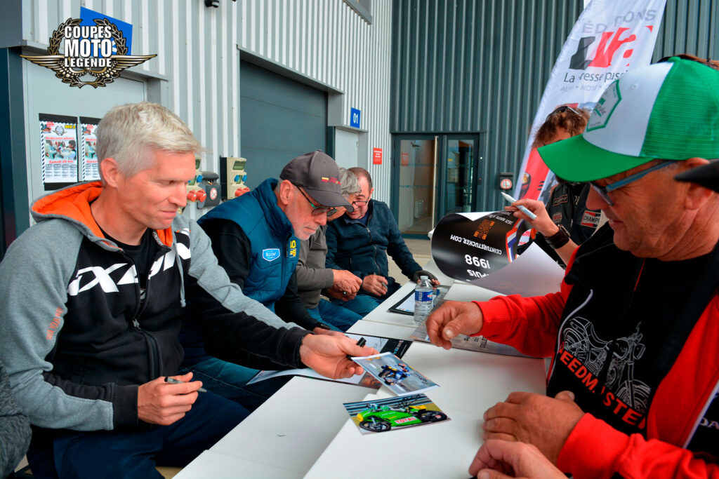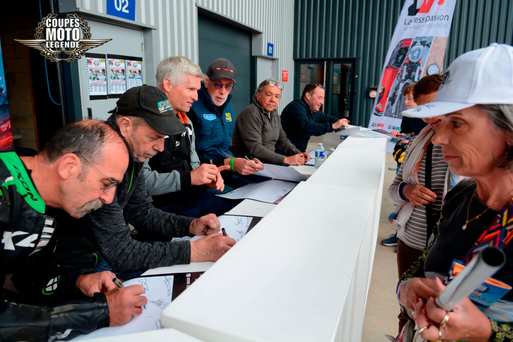Aux Coupes Moto Légende, les séances de dédicaces sont un moment fort et très apprécié des visiteurs. Elles offrent une opportunité unique de rencontrer des pilotes légendaires et des figures emblématiques du monde de la moto, qui sont présents tout au long du week-end.